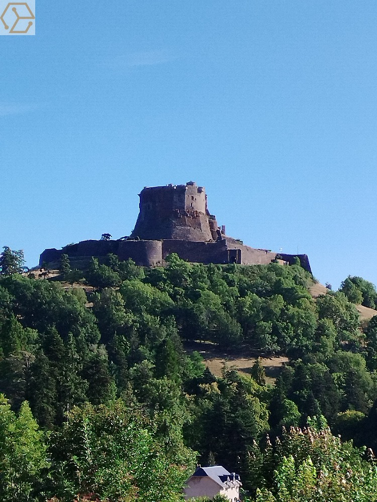 - 1 séjour avec canapé, table basse, tv tnt, livres, banc-coffre à jouets enfants. Fenêtre vue sur le Château de Murol.
