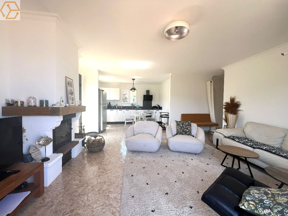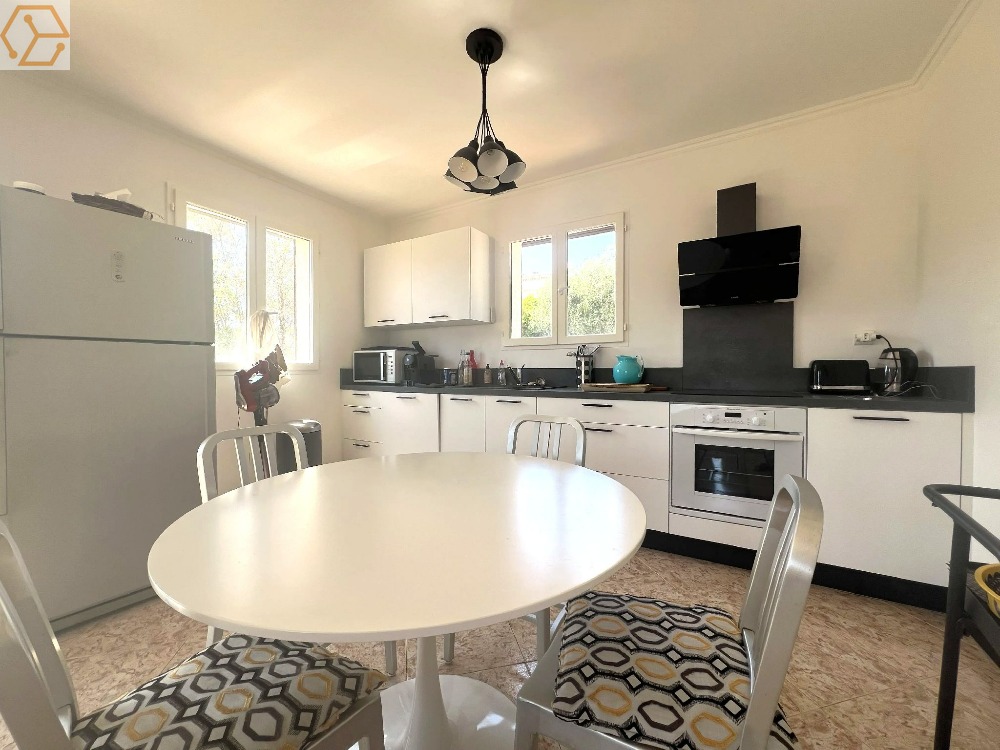 La pièce de vie, baignée de lumière naturelle, séduit par ses volumes et son atmosphère chaleureuse. Elle se compose d'une cuisine ouverte entièrement aménagée et équipée avec une gamme d'électroménager moderne et de qualité, ainsi que d'un confortable séjour climatisé. L'ensemble s'ouvre sur une agréable terrasse, idéale pour des moments de détente, offrant une vue imprenable sur la baie de Calvi.
