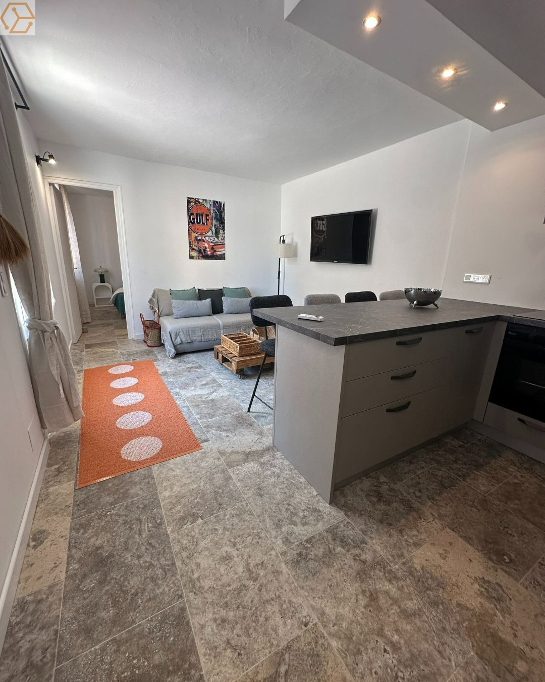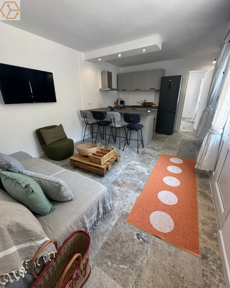 Vous entrerez dans une pièce à vivre lumineuse et climatisée, composée d'une cuisine moderne entièrement équipée et ouverte sur le séjour, idéale pour des moments de convivialité.