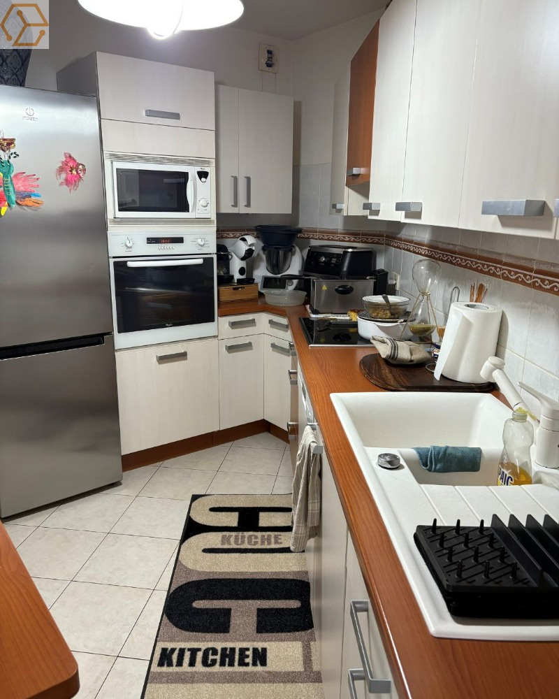 La cuisine séparée, entièrement équipée, donne également accès à la terrasse, créant ainsi un effet de continuité entre l'intérieur et l'extérieur, parfait pour profiter des repas en plein air.