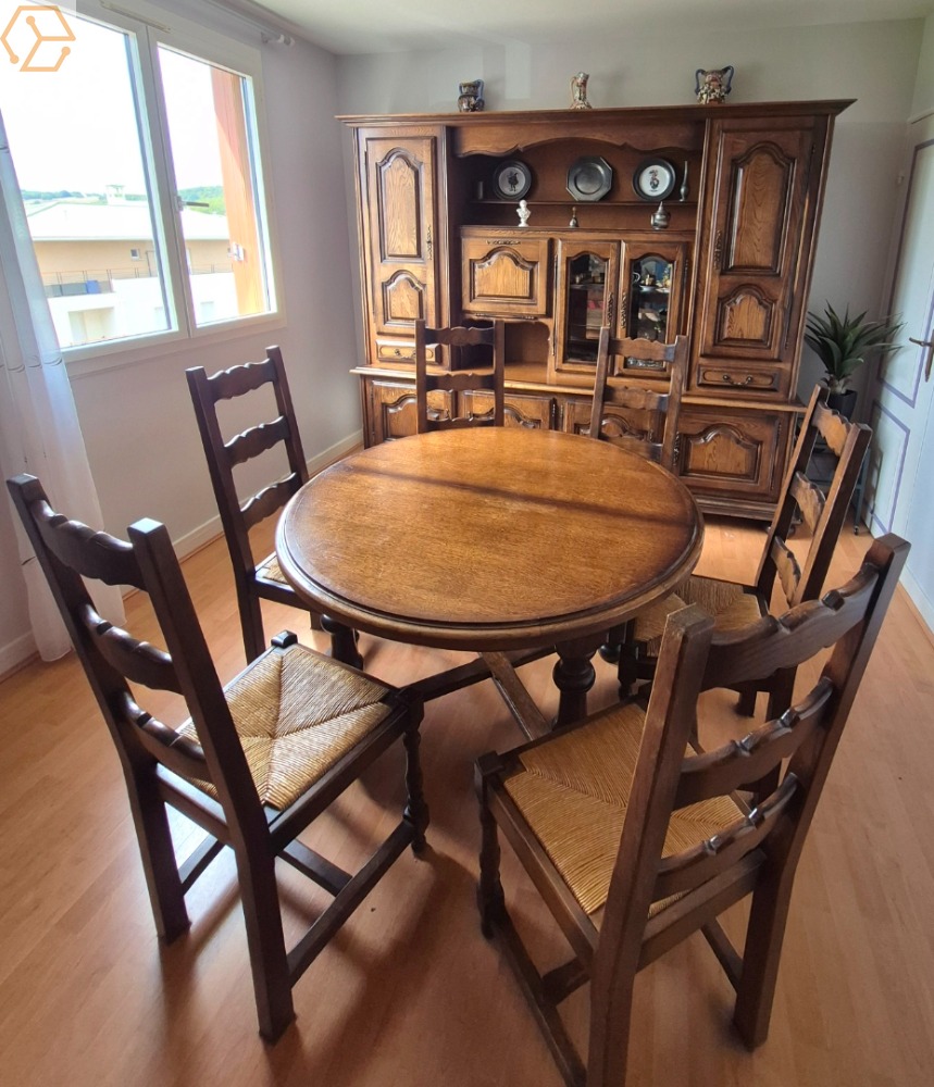 Vends buffet salle à manger en chêne avec table ronde avec rallonge intégrée et 6 chaises bonne qualité à démonter par vos propres moyens