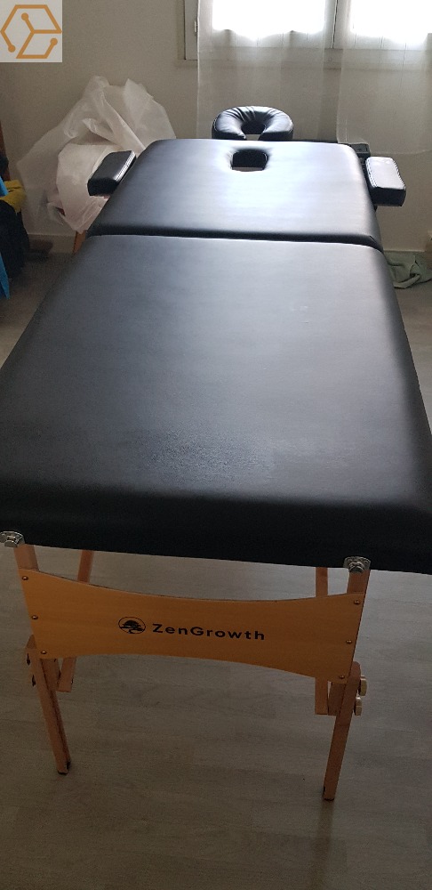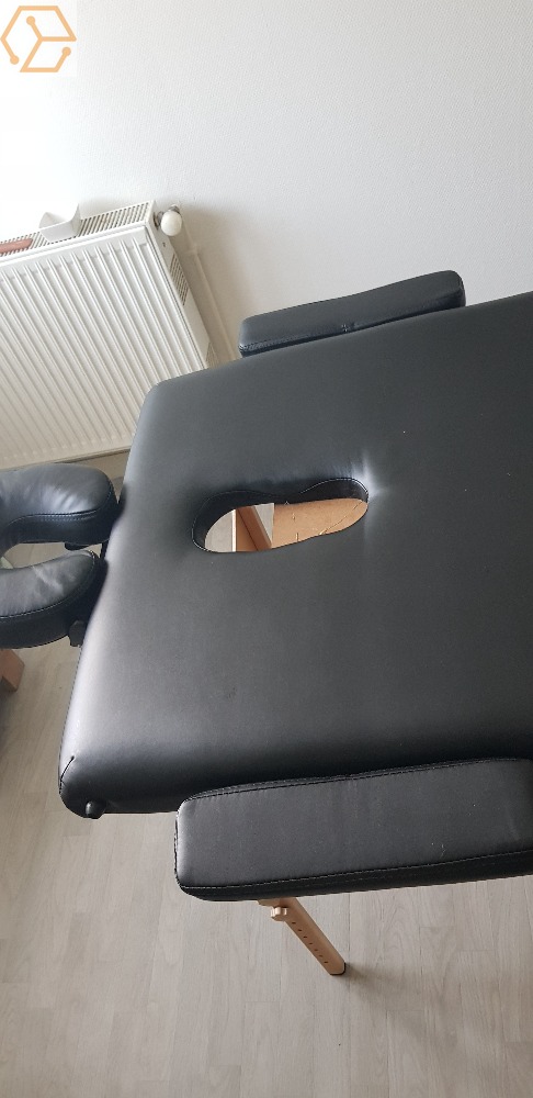 Table de massage professionnelle pliante de couleur noire, Longueur 1,85 cm x Largeur 0,68 cm (0,92 cm avec les accoudoirs) fournie avec tous les accessoires (accoudoirs, têtière, porte produit et sac de transport) date d’achat juin 2025 cause double emploi,