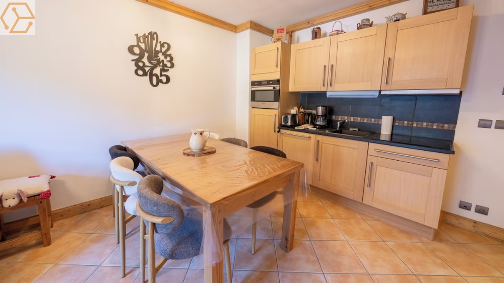 – Une pièce de vie avec cuisine ouverte sur le séjour, terrasse donnant sur l’extérieur et vue imprenable sur le Mont Blanc
